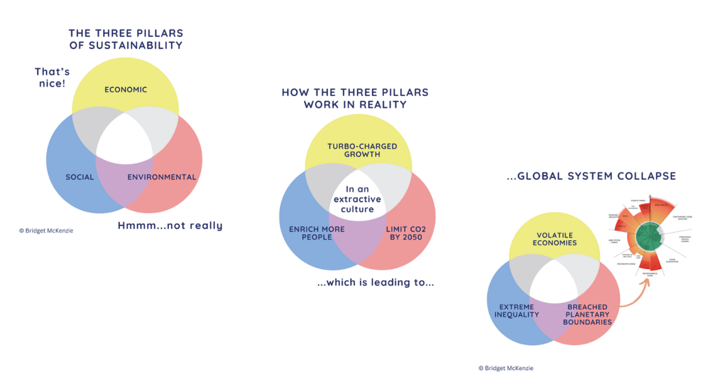 Como consecuencia de este impacto climático global, el rol central de los empresarios con visión estratégica es uno de los principales vehículos por el cuál muchas economías en el sur global serán capaces de rescatar a las comunidades más vulnerables ante la degradación ambiental actual. Estas comunidades vulnerables, dependen en gran medida de los recursos naturales para su sustento y está en las innovaciones empresariales la inmensa oportunidad de cambir el ritmo de Producción-Consumo-Desecho de la economía lineal hacia sistemas productivos de economía circular como el de la siguiente gráfica,