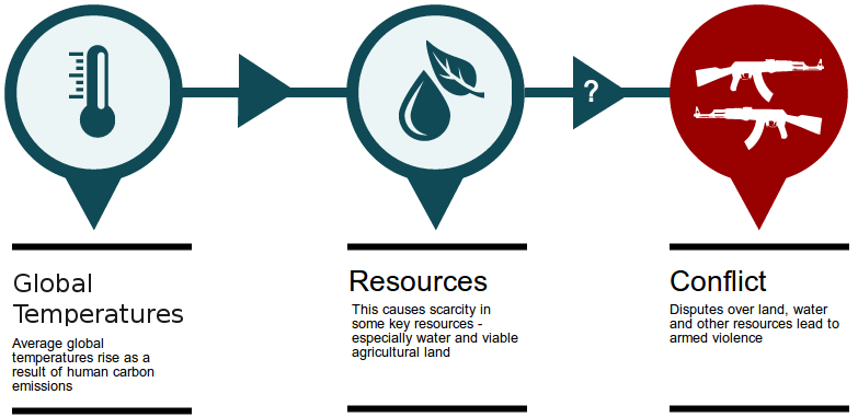 El cambio climático, al alterar los patrones climáticos y reducir la disponibilidad de recursos naturales esenciales como agua y tierras cultivables, puede exacerbar tensiones sociales y económicas, incrementando la probabilidad de conflictos armados. Las poblaciones afectadas por sequías prolongadas, inundaciones y otros eventos extremos pueden verse forzadas a migrar, generando competencia por recursos escasos en las áreas receptoras y potenciales enfrentamientos. Para detener esta trayectoria hacia la conflictividad, es crucial implementar políticas globales y regionales de manejo sostenible de recursos, promover la cooperación internacional para la adaptación climática y la resiliencia comunitaria, e invertir en tecnologías y prácticas agrícolas sostenibles que optimicen el uso de los recursos naturales. Además, fomentar la descarbonización de las economías y el uso de energías renovables reducirá las emisiones de gases de efecto invernadero, mitigando así los impactos más severos del cambio climático.
