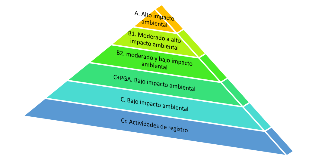 Según el impacto ambiental que tendrán los proyectos los que caigan en la categoría B1 y A de la Ilustración 1 deberán presentar solamente un estudio predictivo “Estudio de impacto ambiental” y un estudio correctivo “Diagnóstico ambiental -DA-”. Para los proyectos de categorías superiores según la Ilustración 1 que corresponden a las siglas CR, C, C+PGA y B2 se requiere una “Evaluación ambiental inicial” predictiva y un “Diagnóstico de Bajo Impacto -DABI-” correctivo.